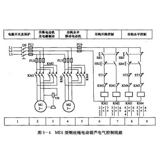 提升電機M1主回路。從圖9-4中2區(qū).3區(qū)的主電路可以看出,起升電機M1主電路為正反.反向電磁制動單元主電路。實用化過程中,接觸器KM1.KM2主觸頭分別控制起升電機M1.反向電源通斷。另外,F(xiàn)U2還實現(xiàn)了熔斷電機M1短路保護功能,電磁閥YB實現(xiàn)了電機M1電磁制動控制動能。